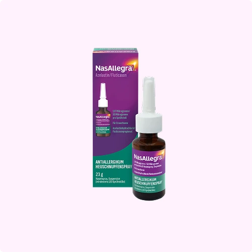 Ganz neu in der Selbstmedikation gibt es jetzt das NasAllegra® Heuschnupfenspray. Die Wirkstoffkombination aus Azelastin (Antihistaminikum) und Fluticason (Glukokortikoid) vereint die Vorteile der beiden oben genannten Wirkstoffgruppen in einem Nasenspray und wird in der Leitlinie1  wirksamer als die jeweilige Monotherapie mit Antihistaminika oder Glukokortikoiden beschrieben.