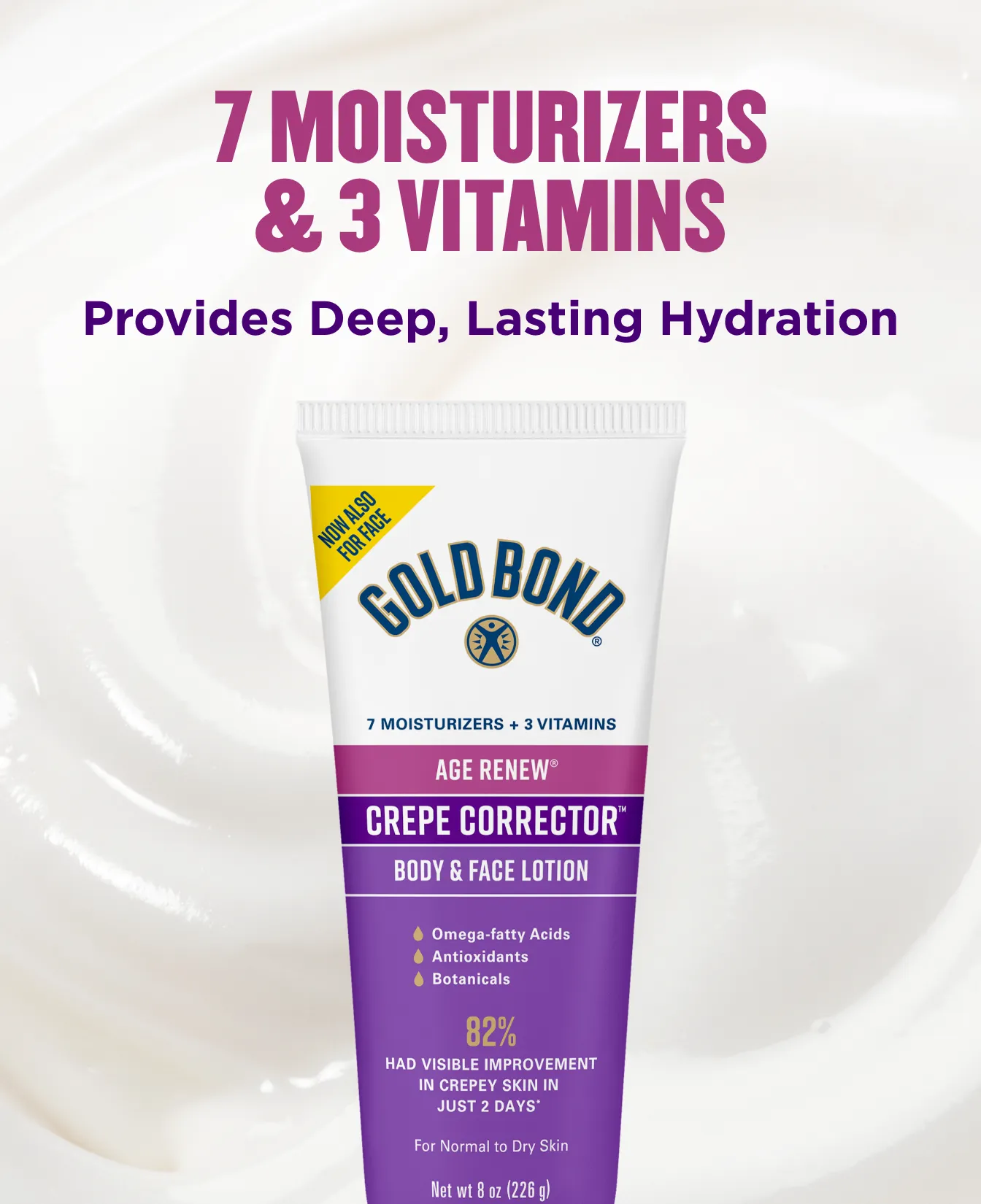 Aging skin can lose its ability to retain moisture, which may lead to finely wrinkled, thin, dry skin — like crepe paper. That’s why we created Gold Bond Age Renew Crepe Corrector Body Lotion.